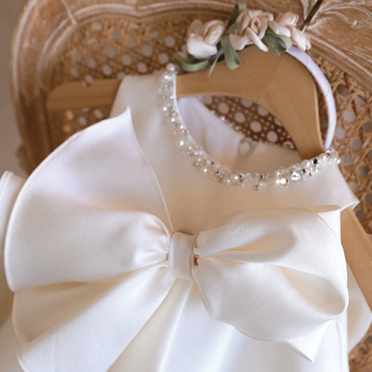 A-line Satin Flower Girl Dress with Sequins and Bow - White