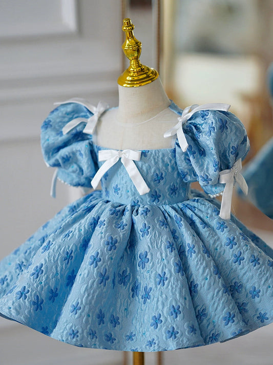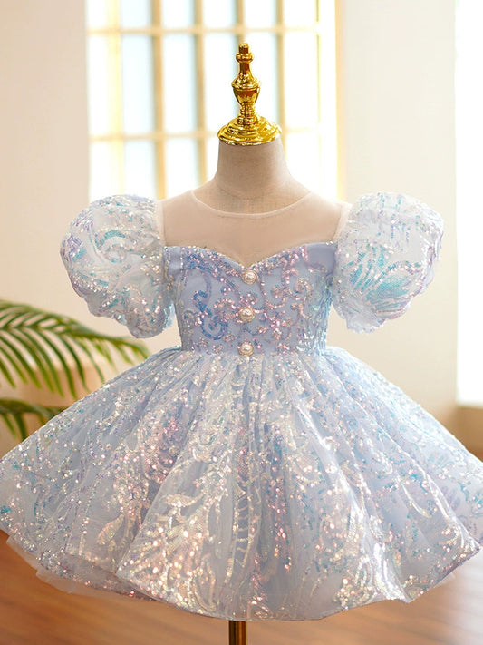 Blue Illusion Neckline Puffy Princess Dress for Girls