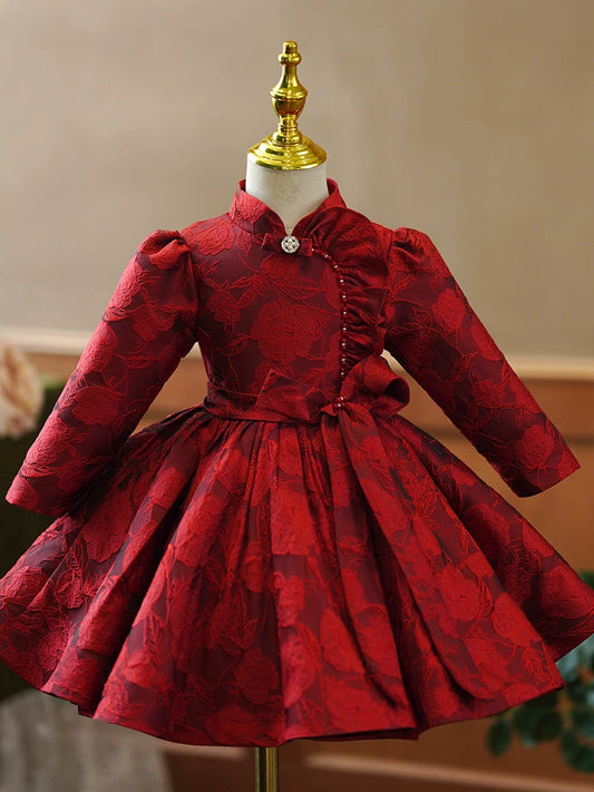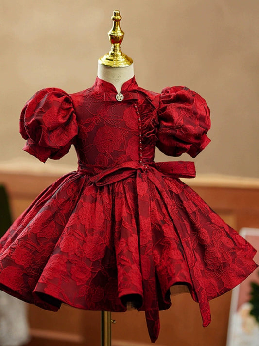 Princess Puffy Satin Flower Girl Dress with Collar in Burgundy