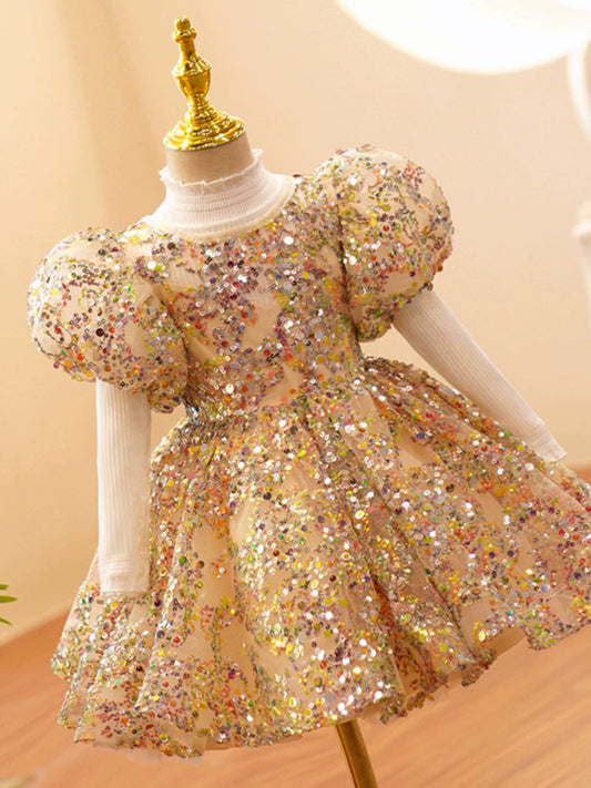 Pink Puffy Sequin Illusion Ball Gown Dress for Kids