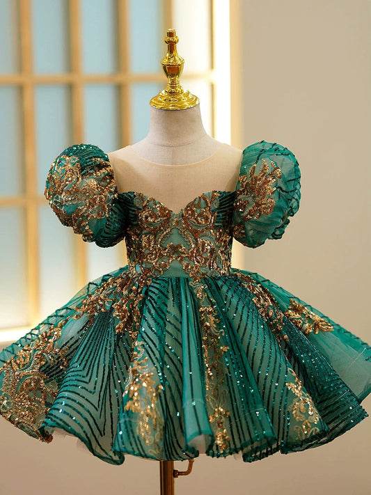 Sage Green Sequin Ball Gown Puffy Flower Girl Dress