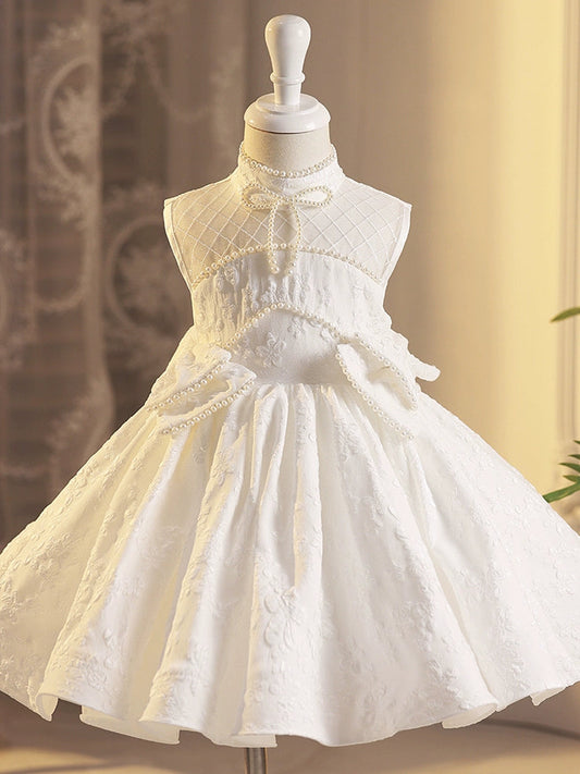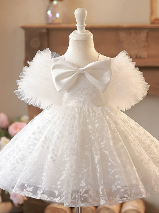 White Tulle Ball Gown Princess Dress for Girls with Bowknot & Lace