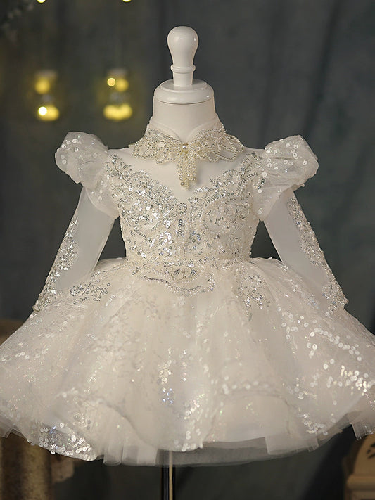 White Puffy Sequin Flower Girl Dress with Bowknot