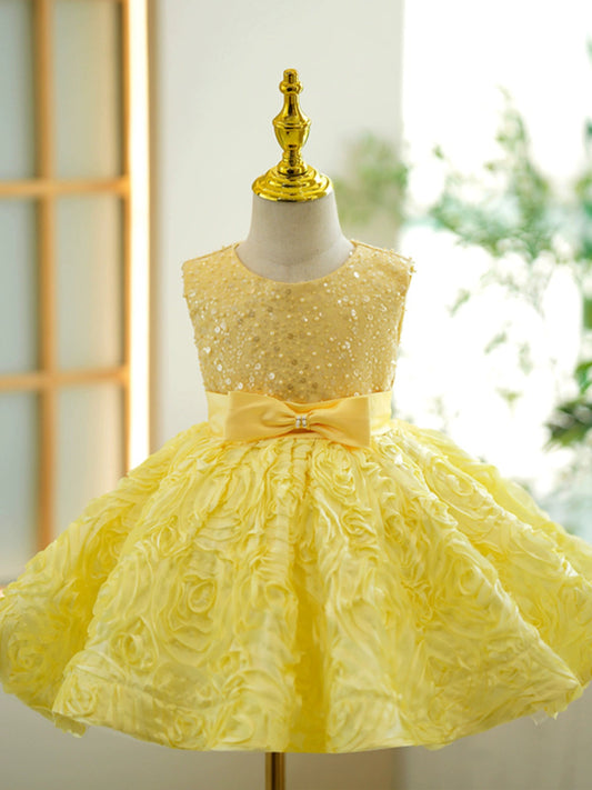 Yellow Sequin Puffy Flower Girl Dress with Bowknot