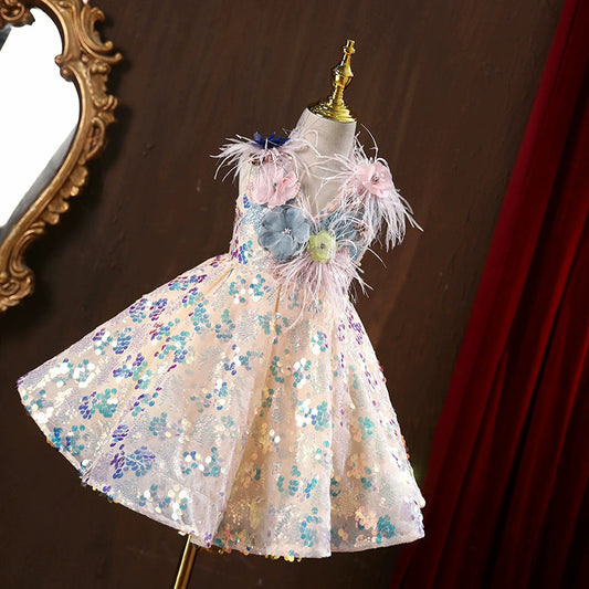 Champagne Sequin V-Neck Puffy Flower Girl Dress