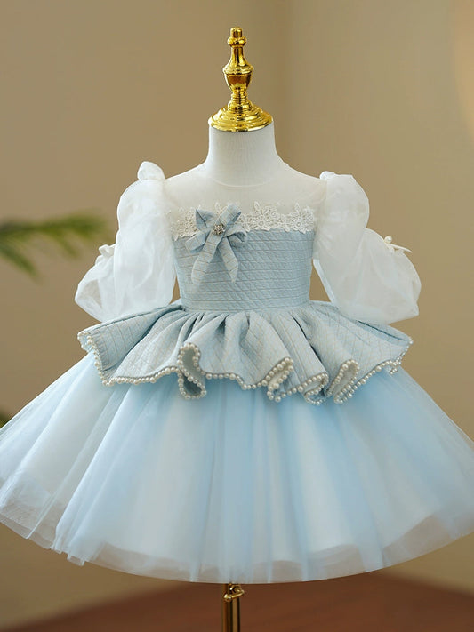 Light Blue Puffy Illusion Neck Flower Girl Dress
