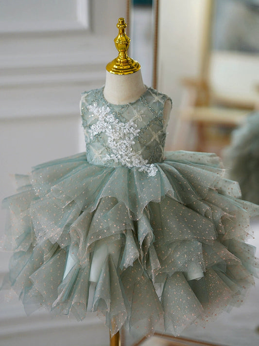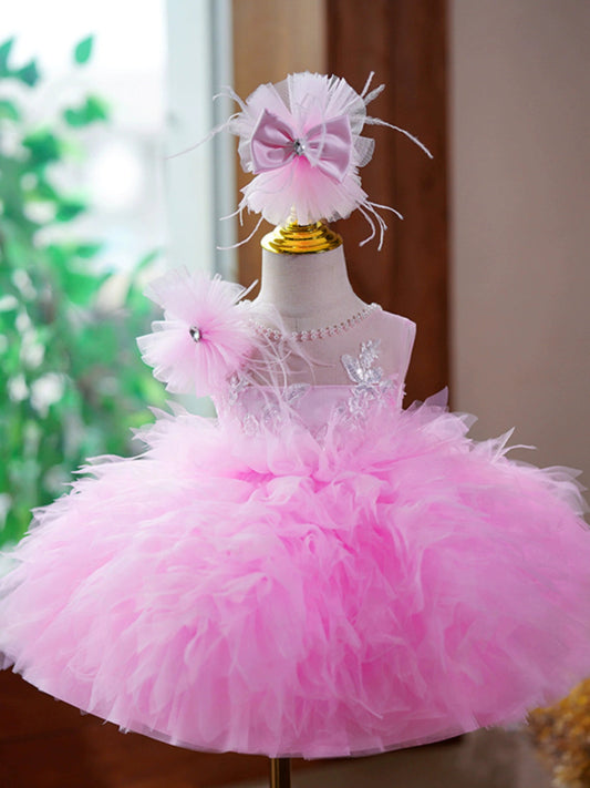 Princess Puffy Pink Flower Girl Dress with Appliqué and Sequins