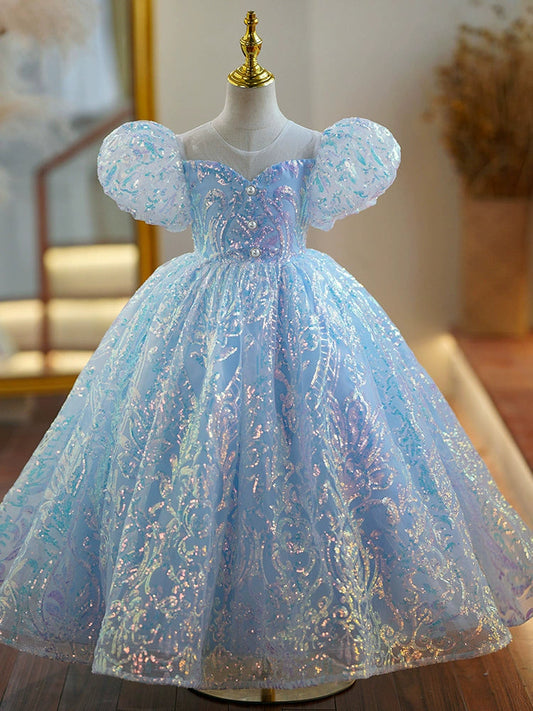Light Blue Sequin Ball Gown Flower Girl Dress with Sweetheart Neckline