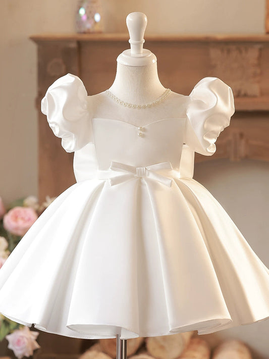 White Princess Puffy Knee-Length Satin Flower Girl Dress