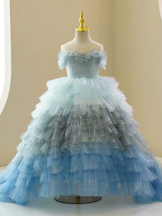 Dusty Blue Princess Ball Gown High-Low Tulle Dress for Girls