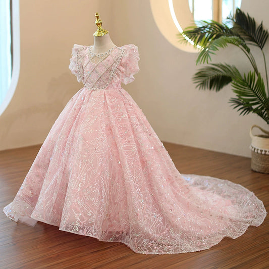 Pink High-Low Princess Dress with Sequin Train for Girls