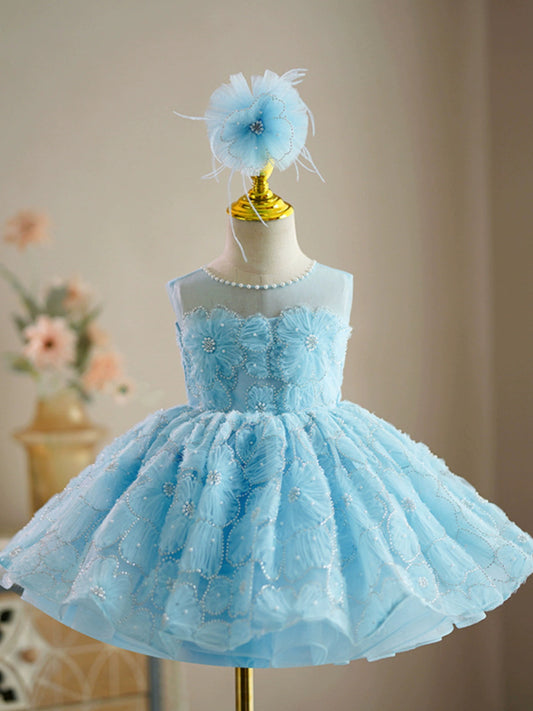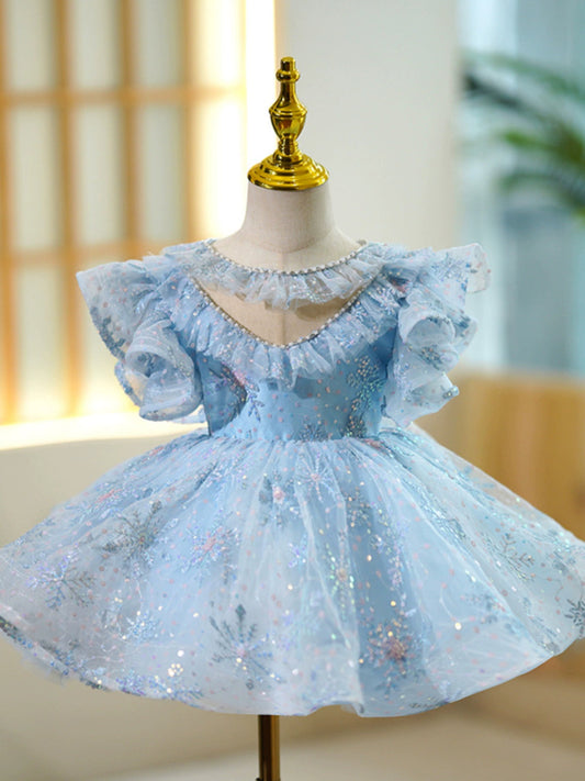 Blue Puffy Tulle Flower Girl Dress with Sequin Embellishment