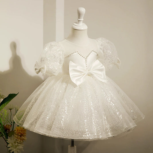 White Tulle A-Line Flower Girl Dress with Bow and Sequins