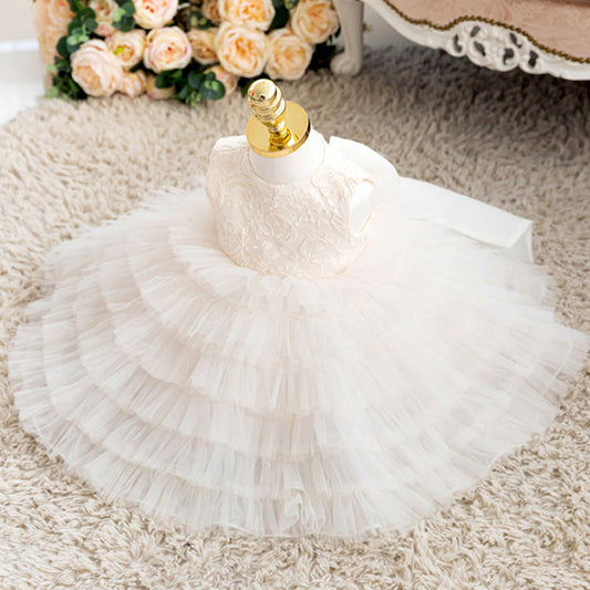 White Flower Girl Tulle Dress with Bowknot and Lace Appliqué
