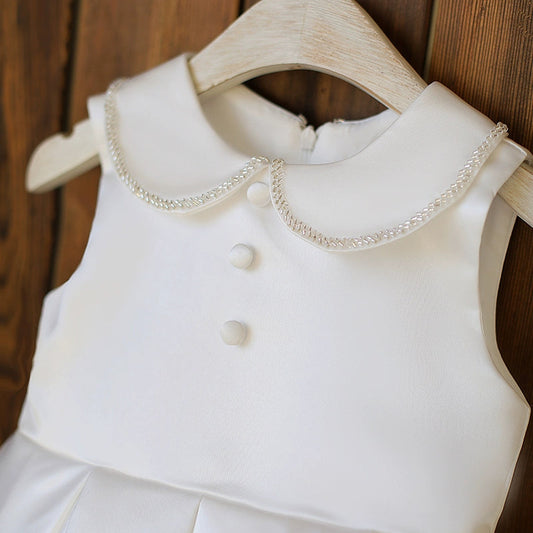 Princess Collared Neck Tea Length Satin Flower Girl Dress in White