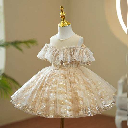 Champagne Sequined Off Shoulder Ball Gown Flower Girl Dress