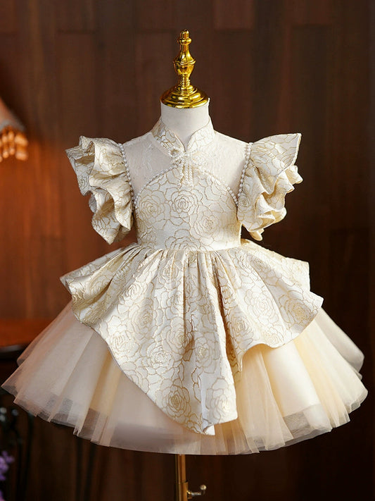 Princess Champagne Mock Neck Tiered Ball Gown Dress for Girls