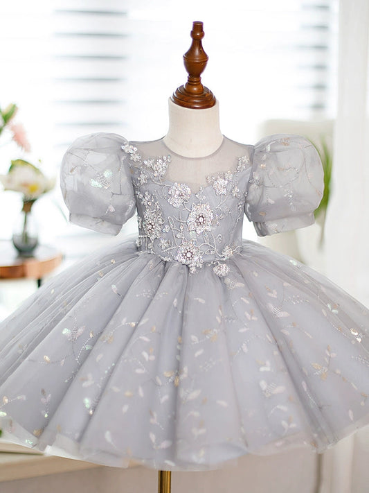 Grey Sequin Off Shoulder Puffy Flower Girl Dress