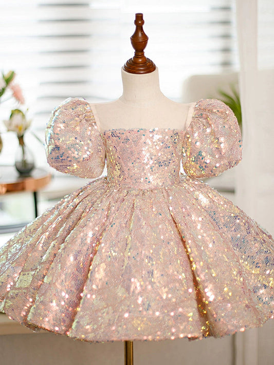 Pink Sequined Ball Gown Flower Girl Dress with Sweetheart Neckline