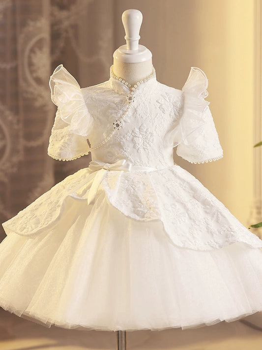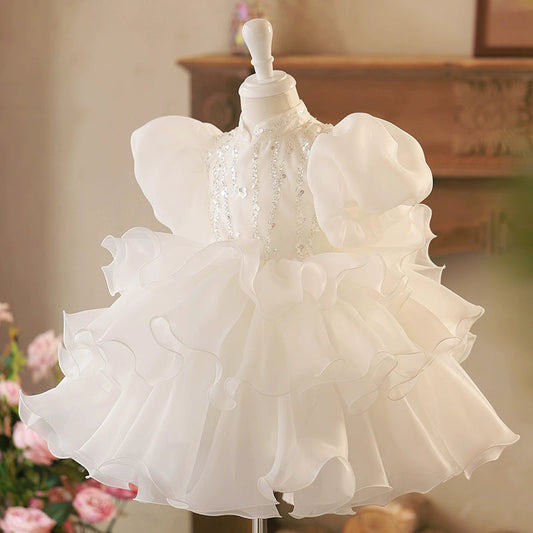 Princess Ball Gown Organza Flower Girl Dress with Collar – White