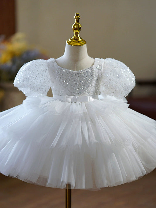 White Princess Ball Gown Tulle Dress with Sequins for Girls