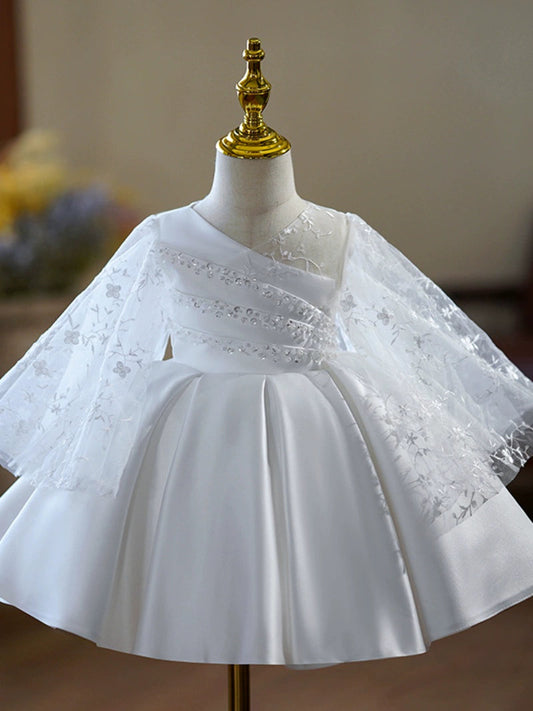 White Princess Puffy Knee-Length Satin Flower Girl Dress