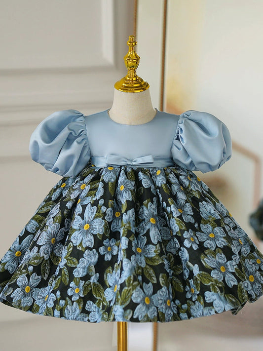 Princess Puffy Navy Blue Flower Girl Dress with Floral Print