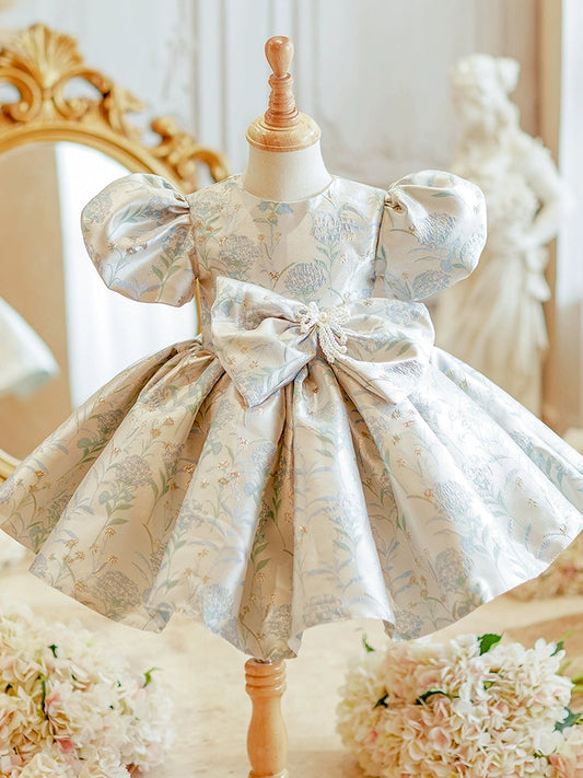 Light Blue Princess Puffy Flower Girl Dress with Bowknot and Sequins