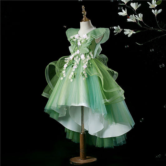 Green High-Low Tulle Flower Girl Dress with Embroidery and Flowers