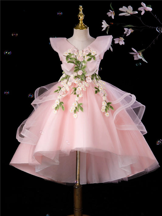 Fluffy Flower Girl High-Low Dress with Embroidery and Sequins