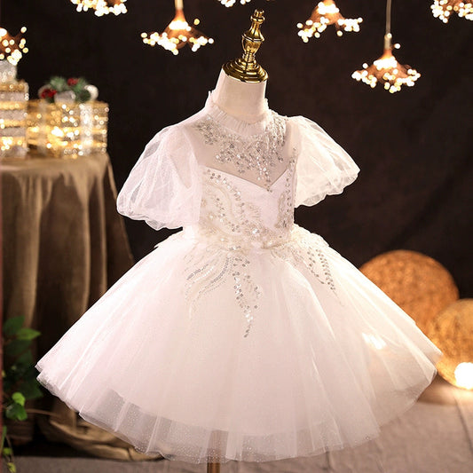 Princess Collared Neck Sequined Tulle Flower Girl Dress – White