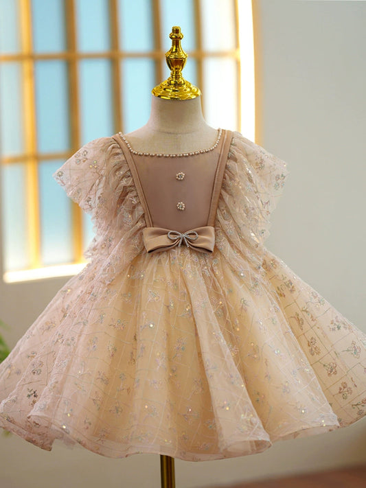 Champagne Puffy Mesh Flower Girl Dress with Bow and Sequins