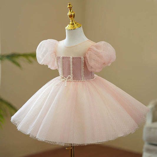 Princess Puffy Pink Flower Girl Dress with Appliqué and Sequins