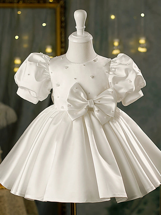 White A-Line Princess Satin Dress for Girls with Bow and Sequins