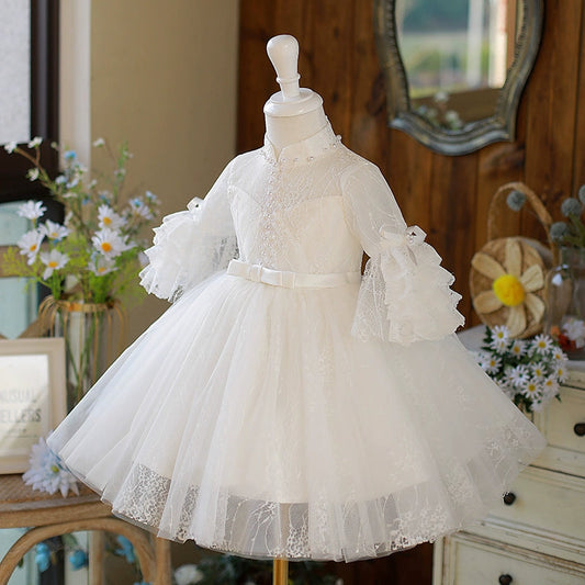 Princess Mock Neck Tea Length Lace Flower Girl Dress in White