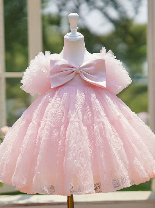 Princess Pink Tulle Flower Girl Dress with Bow and Flowers
